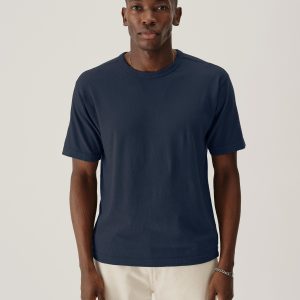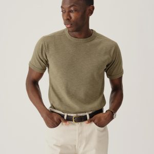Classic fit short sleeve sweater tee with a straight hem. Yarn-dyed 16 gauge cotton jersey features light slub texture. Features double layer 1×1 ribbing at the collar and rib finishing at the cuffs and hem. Constructed with hand-linked seams for improved durability.