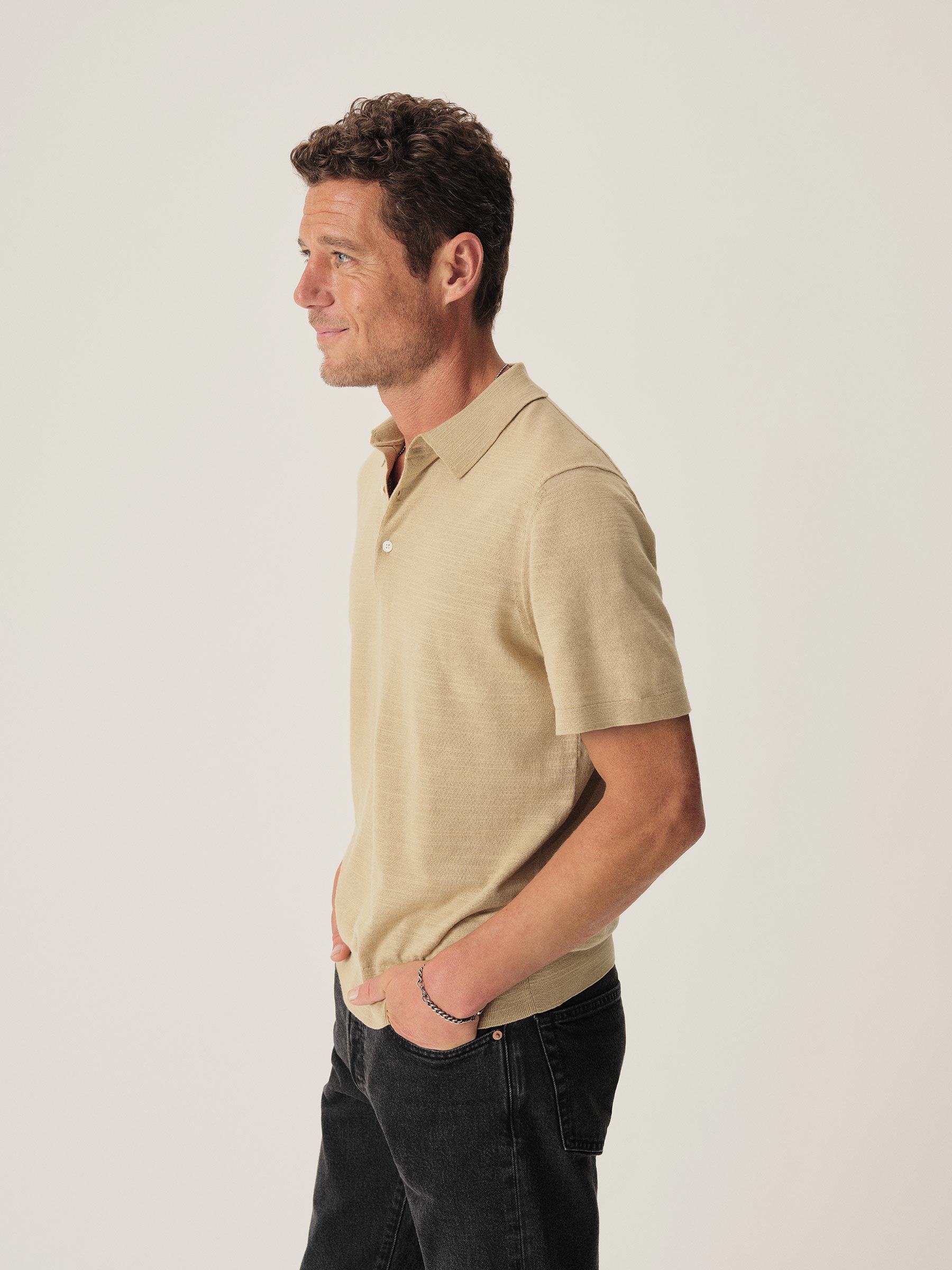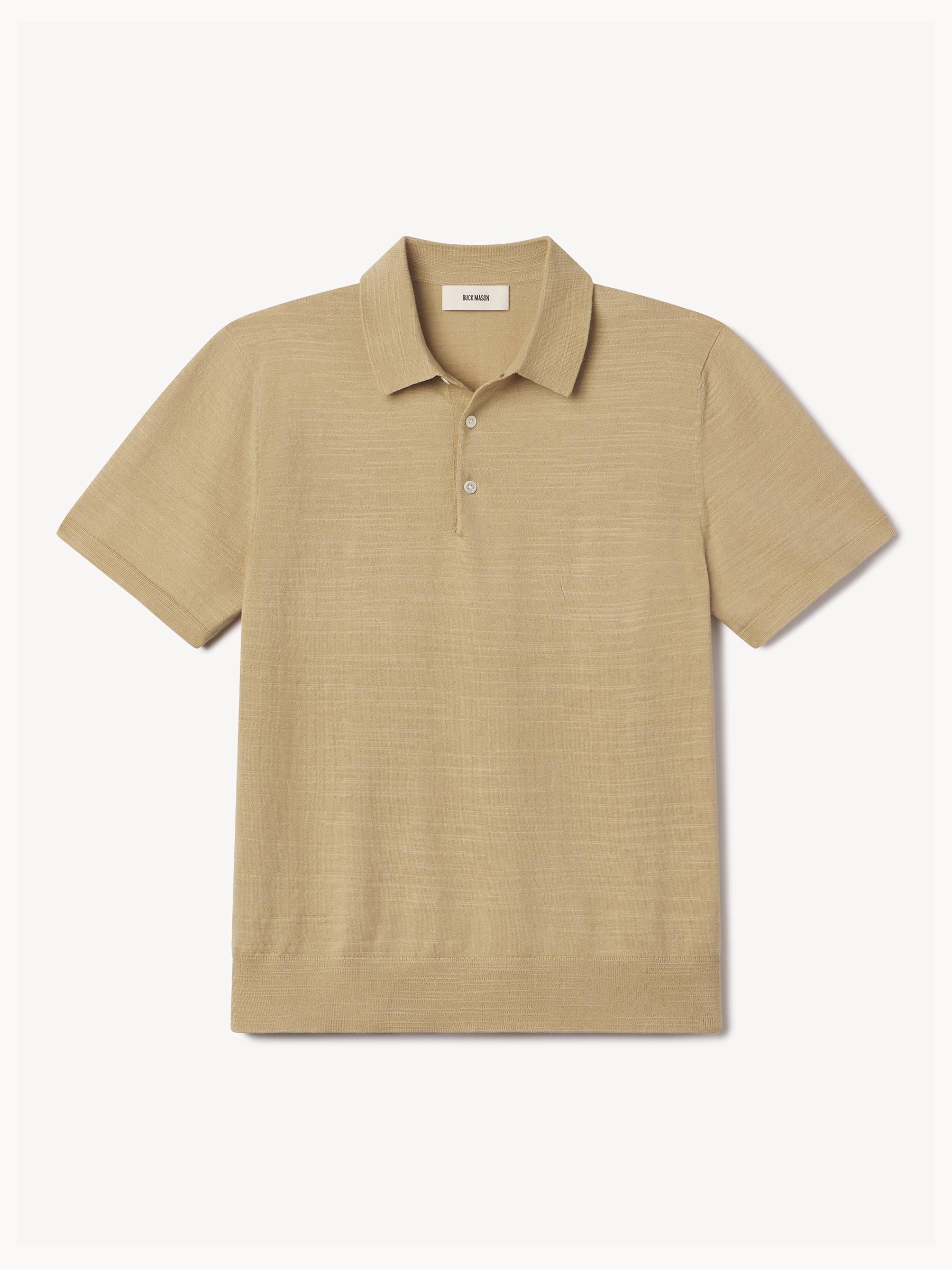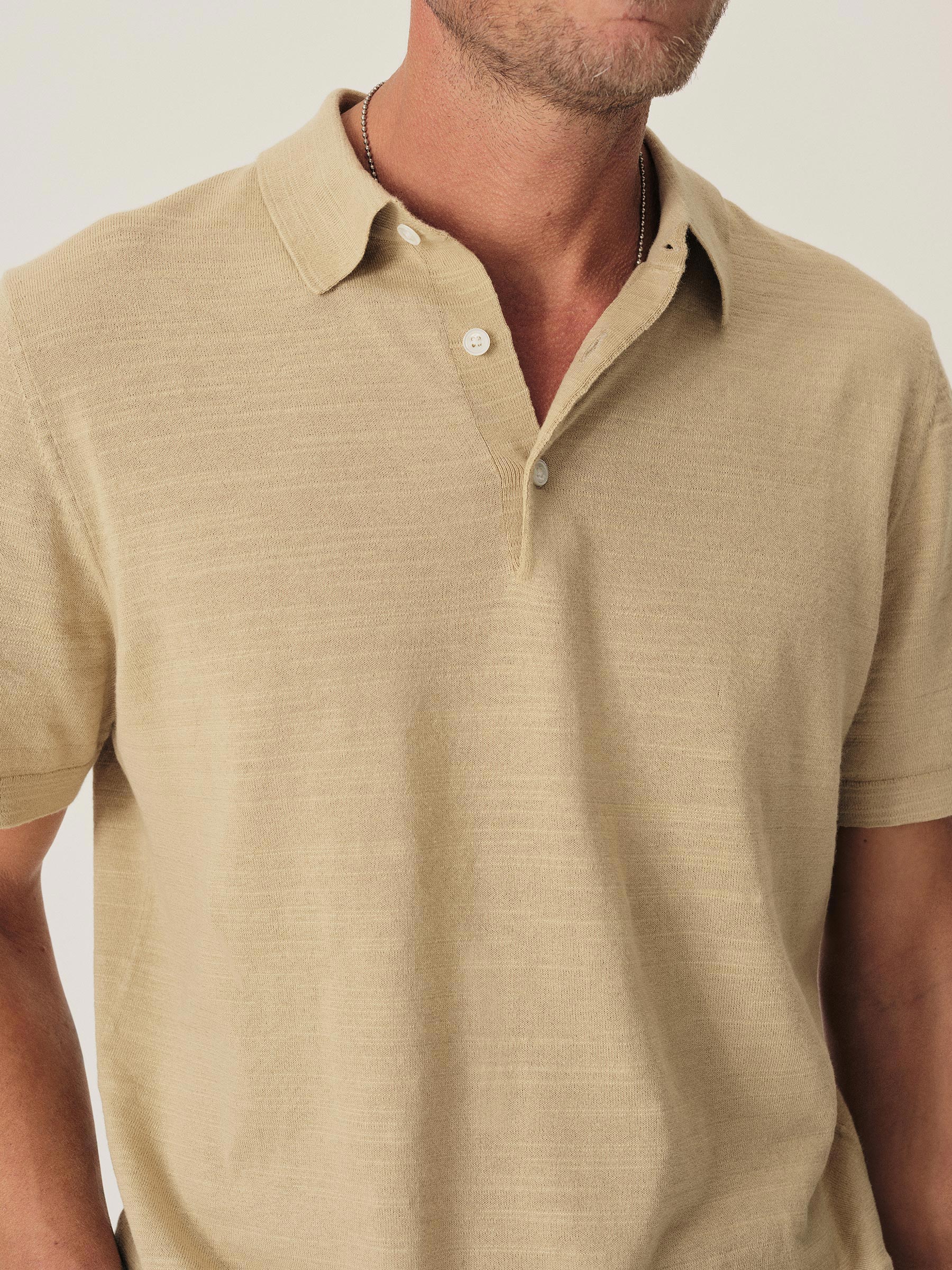 Classic fit sweater polo in yarn-dyed 16 gauge cotton jersey with light slub texture. Features a three-button closure and rib finishing at the cuffs and hem. Constructed with hand-linked seams for improved durability.