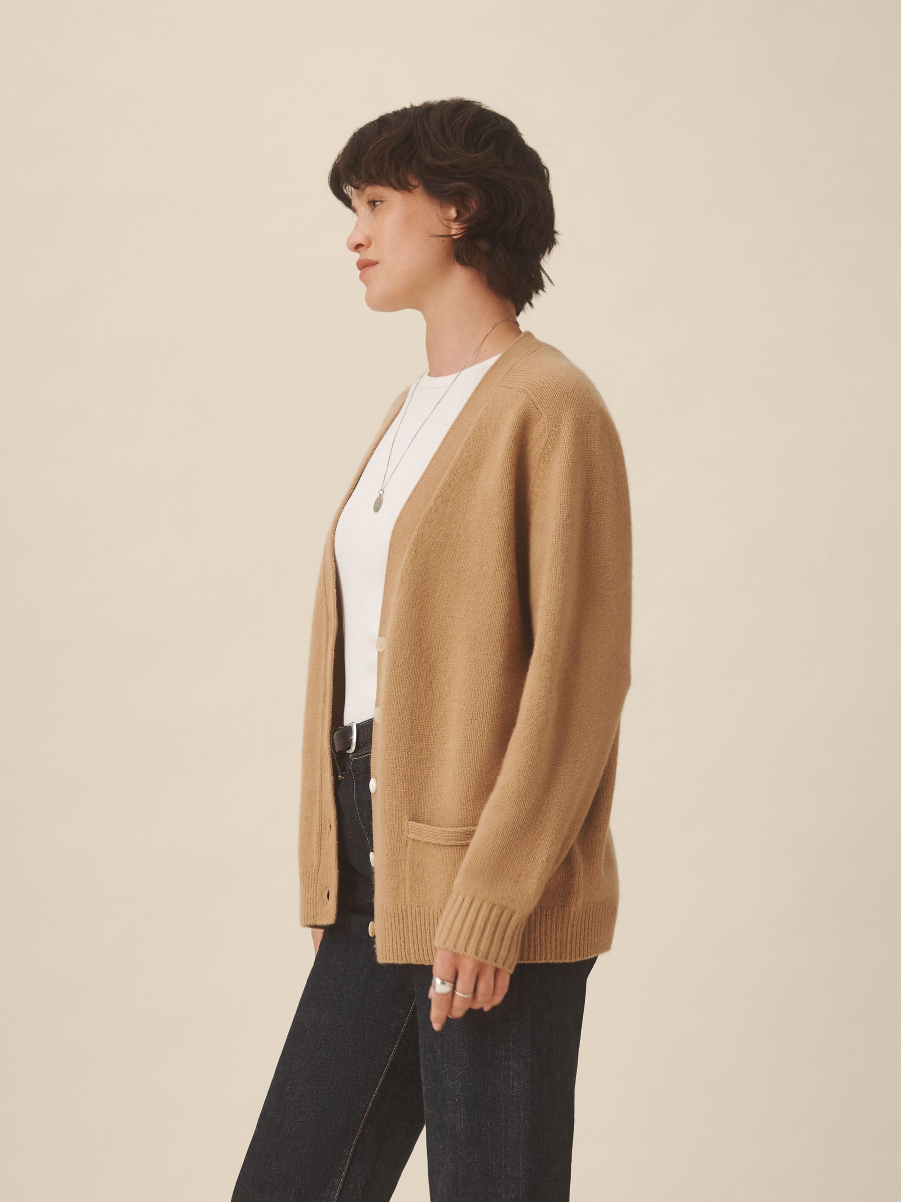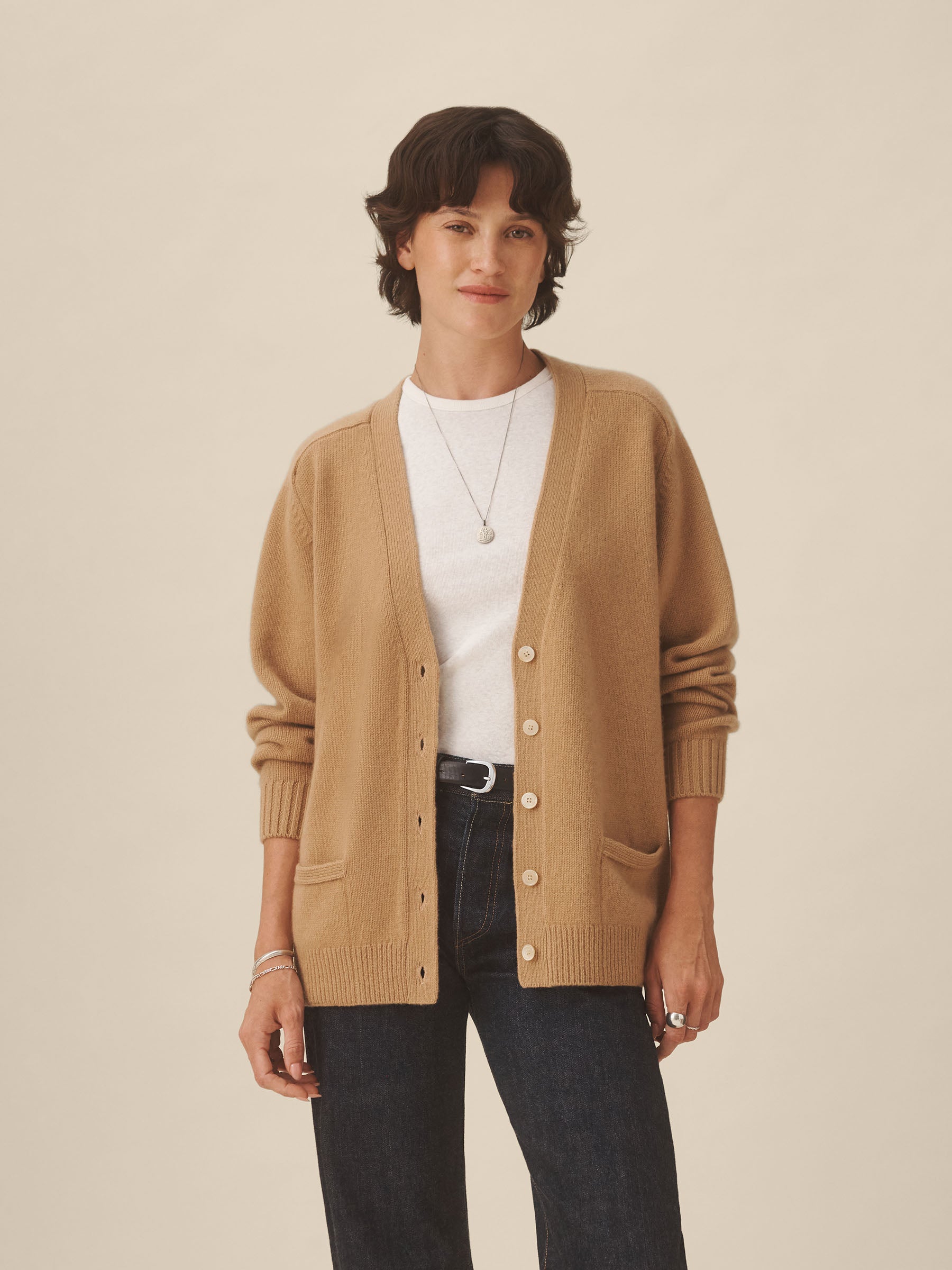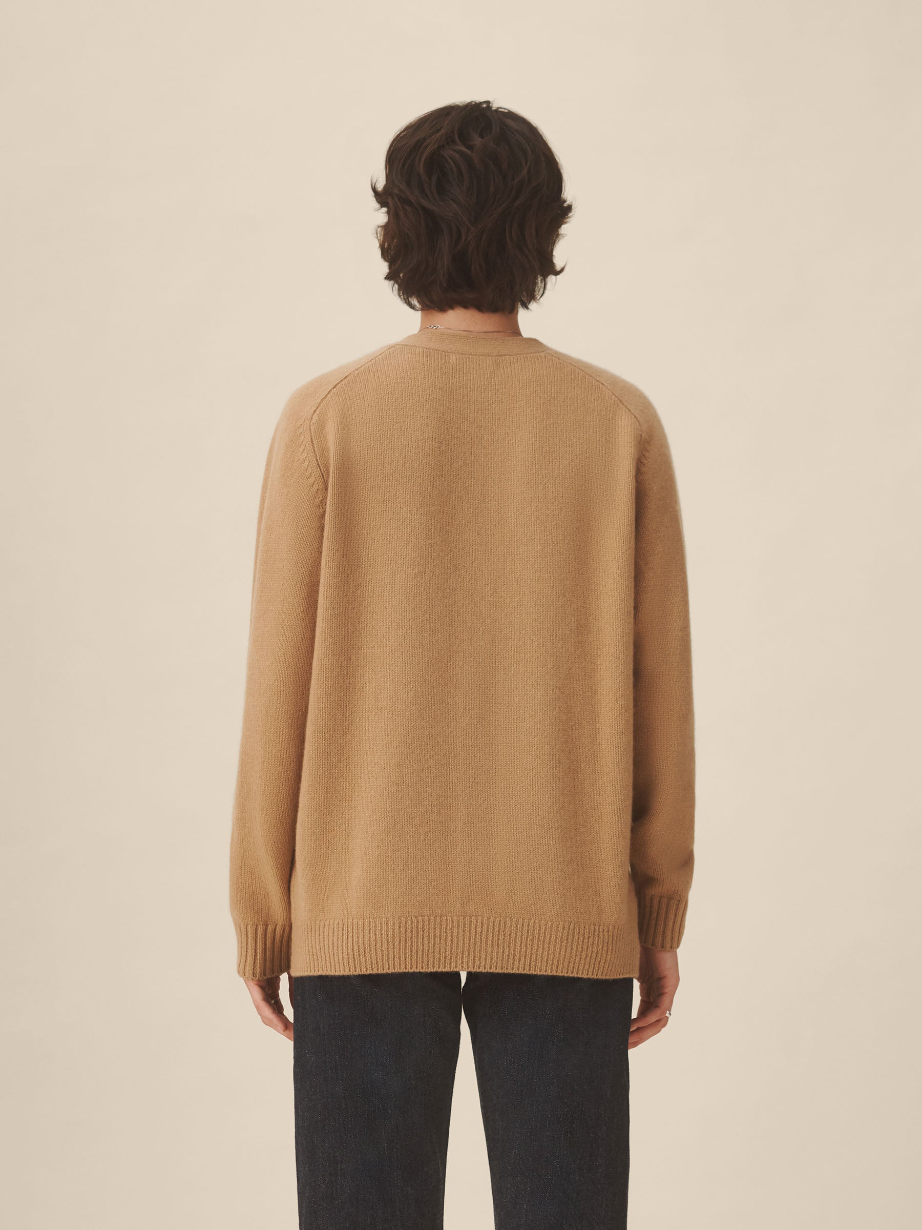 Inspired by vintage “grandfather” cardigans, a sweater made from 100% cashmere in a soft jersey stitch with natural drape and structure. Designed with an oversized fit and saddle armholes, it’s finished with rib trims at the cuffs and hem, functional buttons at the center front, and cleanly finished pockets.