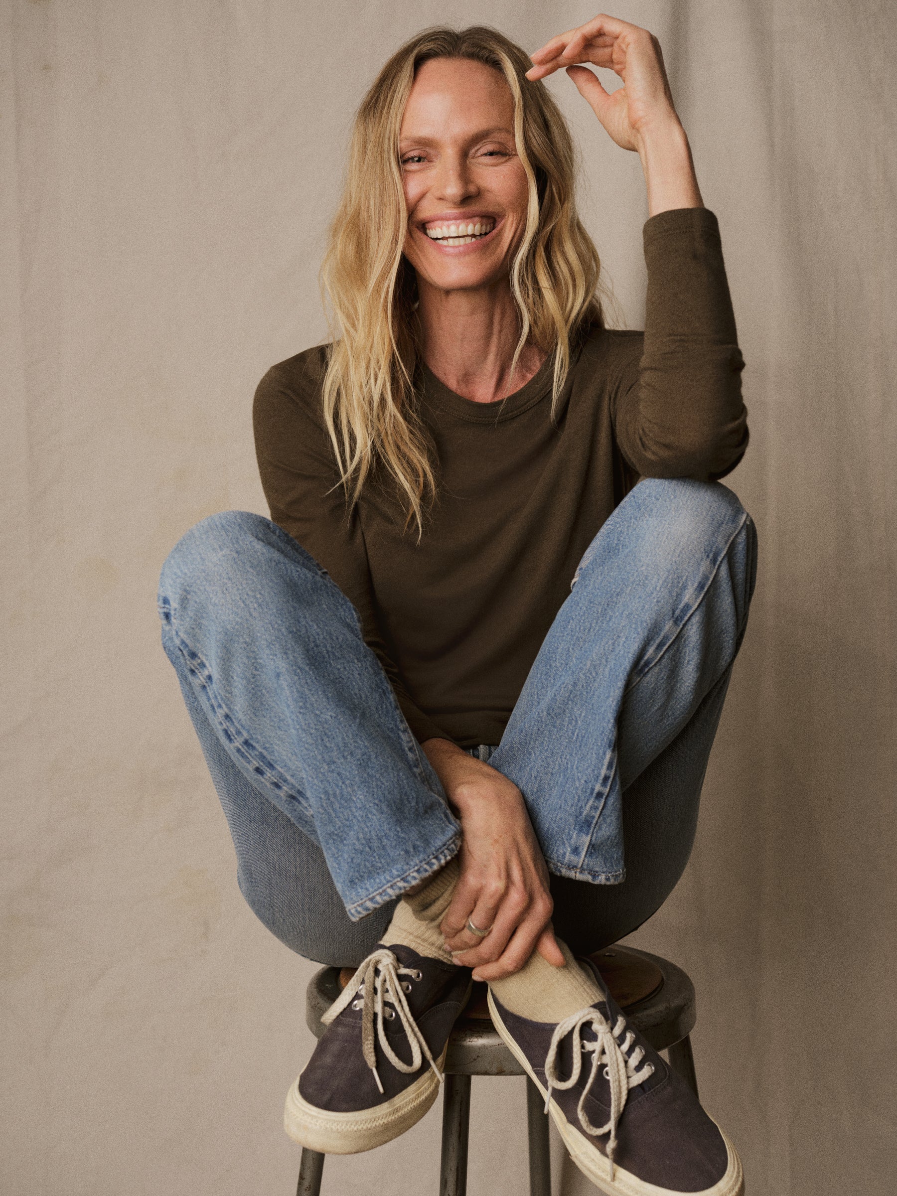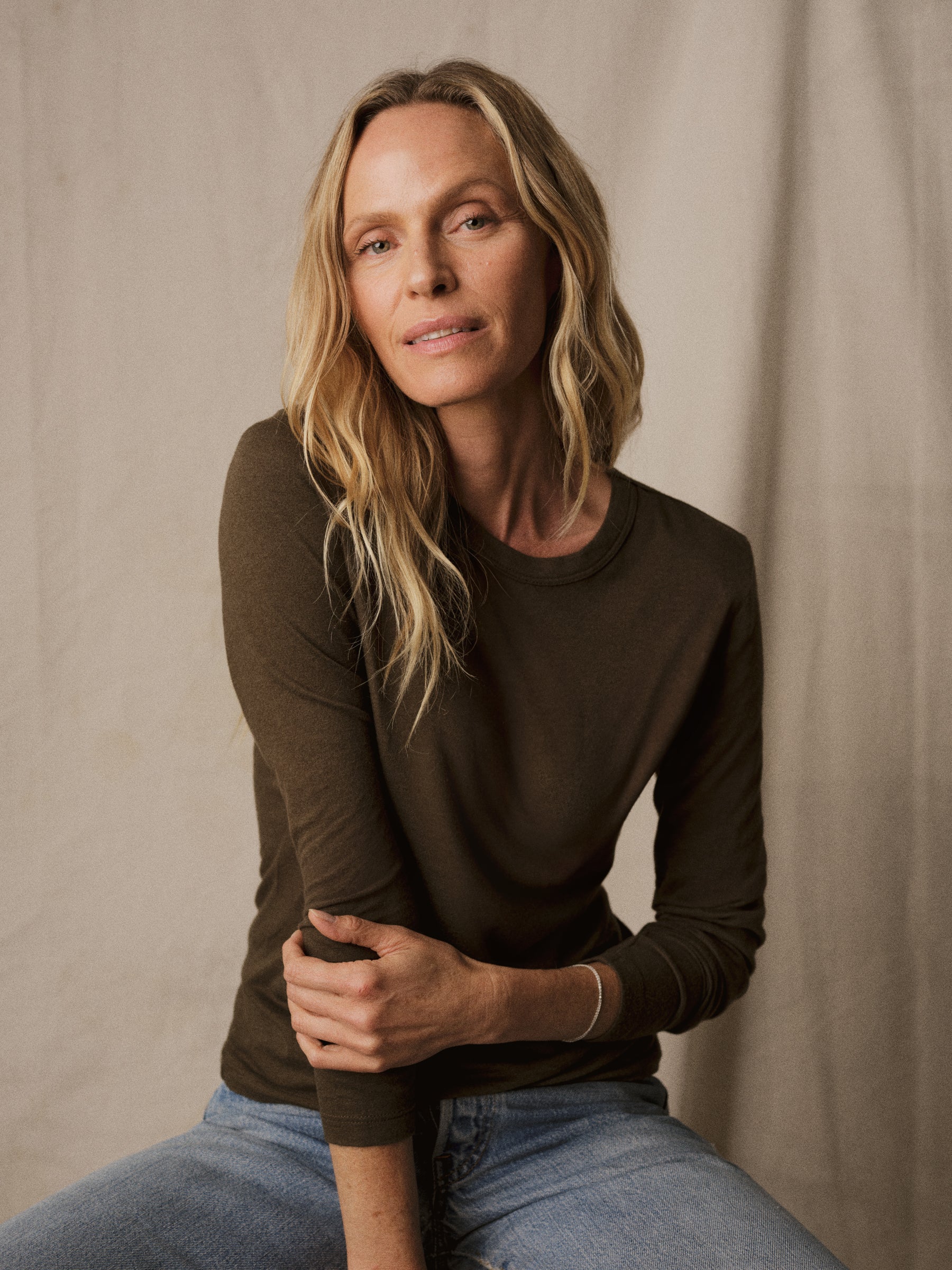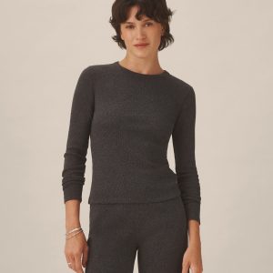 Slim fit long sleeve crewneck tee cut from a supersoft 130 GSM blend of bamboo, cotton, and wool. Features a straight hem, a self bound neck, and raised armholes that hug the contours of the shoulders. Garment washed for a lived-in feel.
