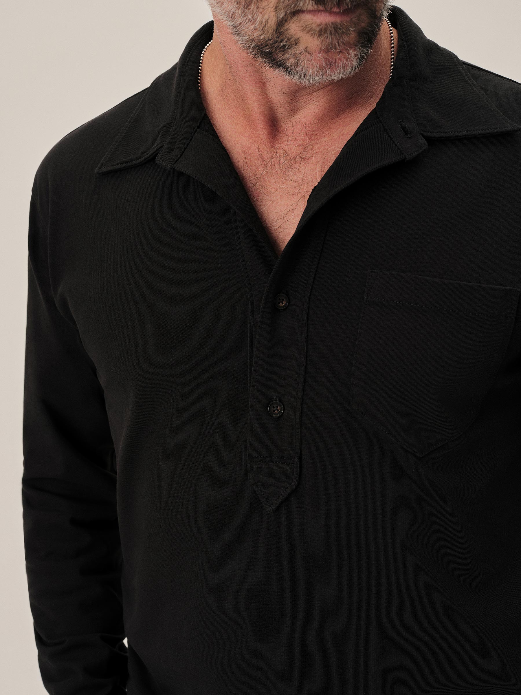 A popover shirt made from a midweight compact cotton jersey with a smooth, uniform texture and cool hand. It features a traditional shirt collar with a four-button half placket and single chest pocket. Ribbed sleeve cuffs.