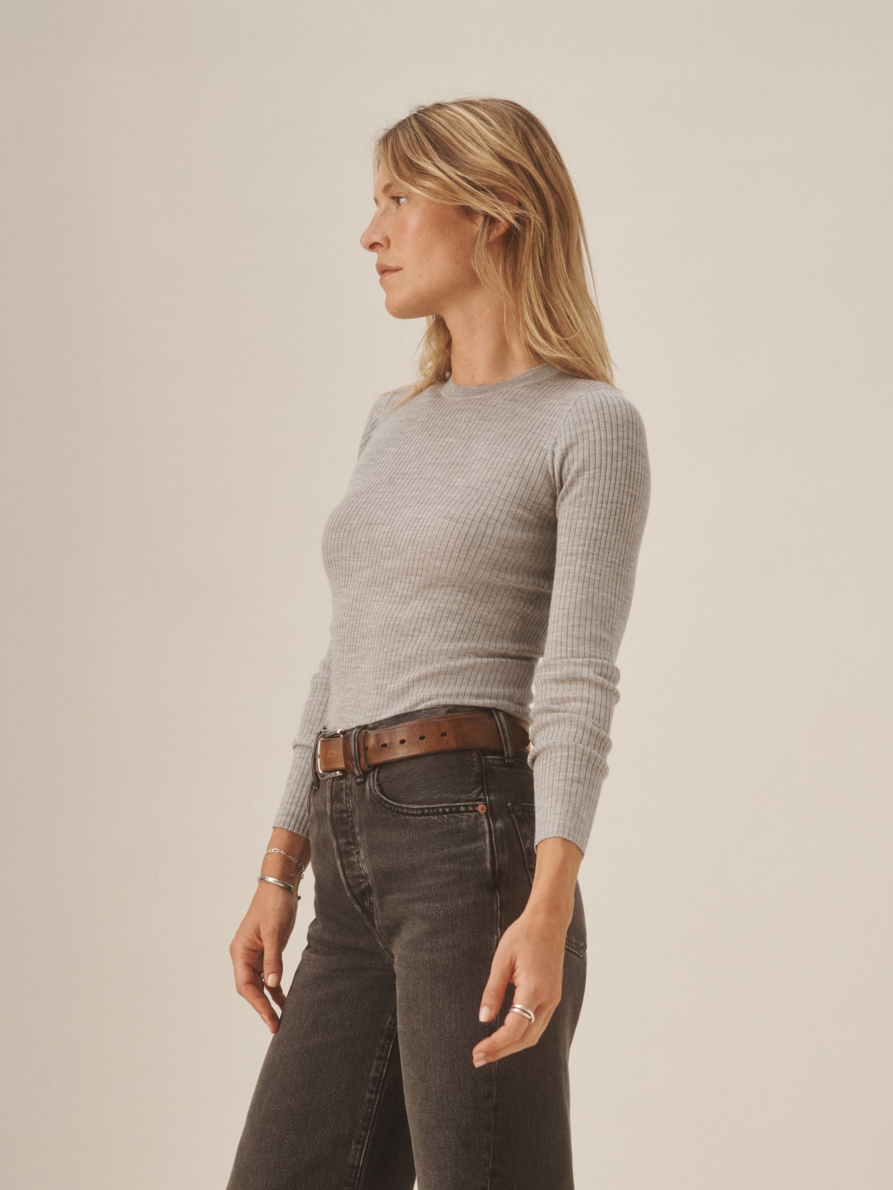 Slim fit crewneck sweater in a 24″” length, elevated in a 14 gauge variegated rib knit from a blend of merino wool, silk, and cashmere. Luxe, easy, and ideal for layering. Constructed with self-starting hem and sleeve trim and fashioning at the neckline and back shoulder for durability.