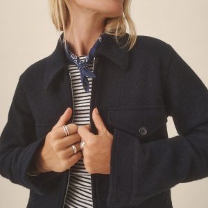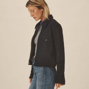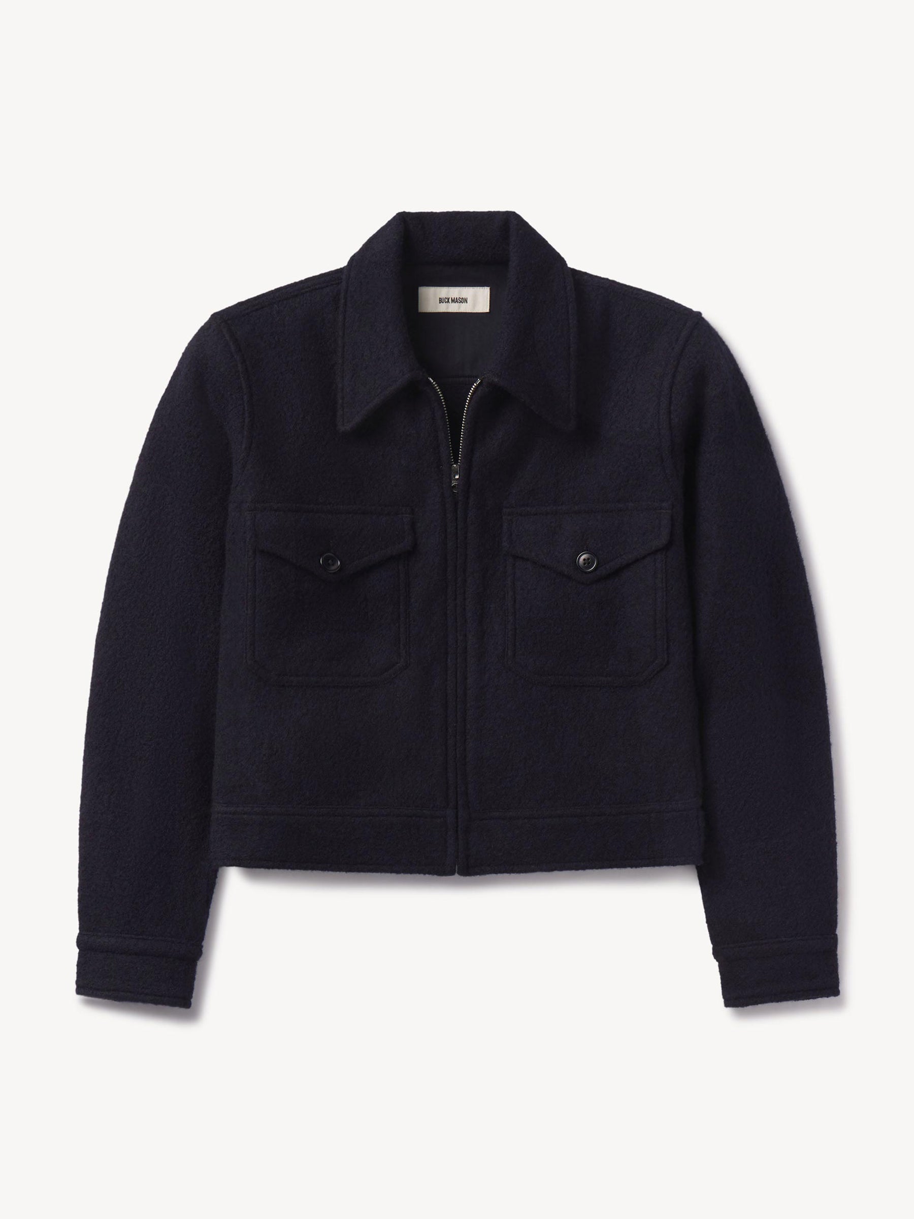 Relaxed utility jacket inspired by vintage mechanic uniforms. Cut from structured 340 GSM felted merino wool, twice boiled for improved insulation and durability. Details include a zipper front, chest pockets, and button-through cuffs. Back tabs can be adjusted for a more fitted waist.