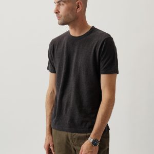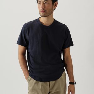 Nautical-inspired boxy fit short sleeve wide neck tee with a straight hem, longer sleeve length, drop shoulder, high neck, and wide ribbed collar. The soft cotton jersey, yarn-dyed in indigo and black sulfur stripe pattern, is about twice as heavy as our Pima tees, with tiny vertical ribs that gently glide across the skin. This is a solid, substantial stand-alone tee for cold weather that will pick up a ton of character over time.