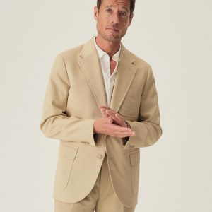 Tailored 3-roll-2 button blazer, Bemberg-lined with full canvas construction. Details include three patch pockets, three internal welt pockets, notch lapel, and a hook center vent.