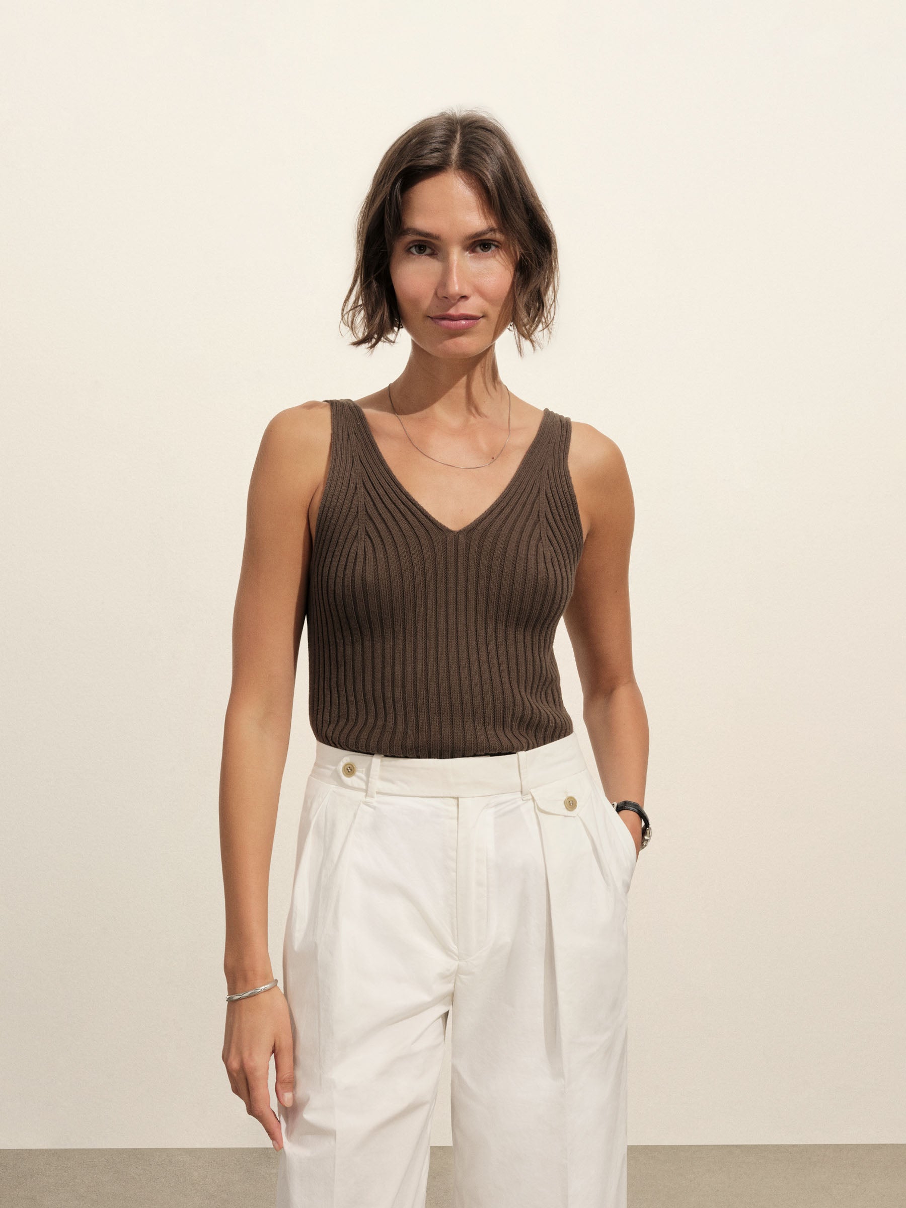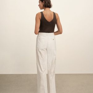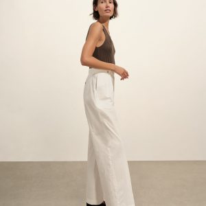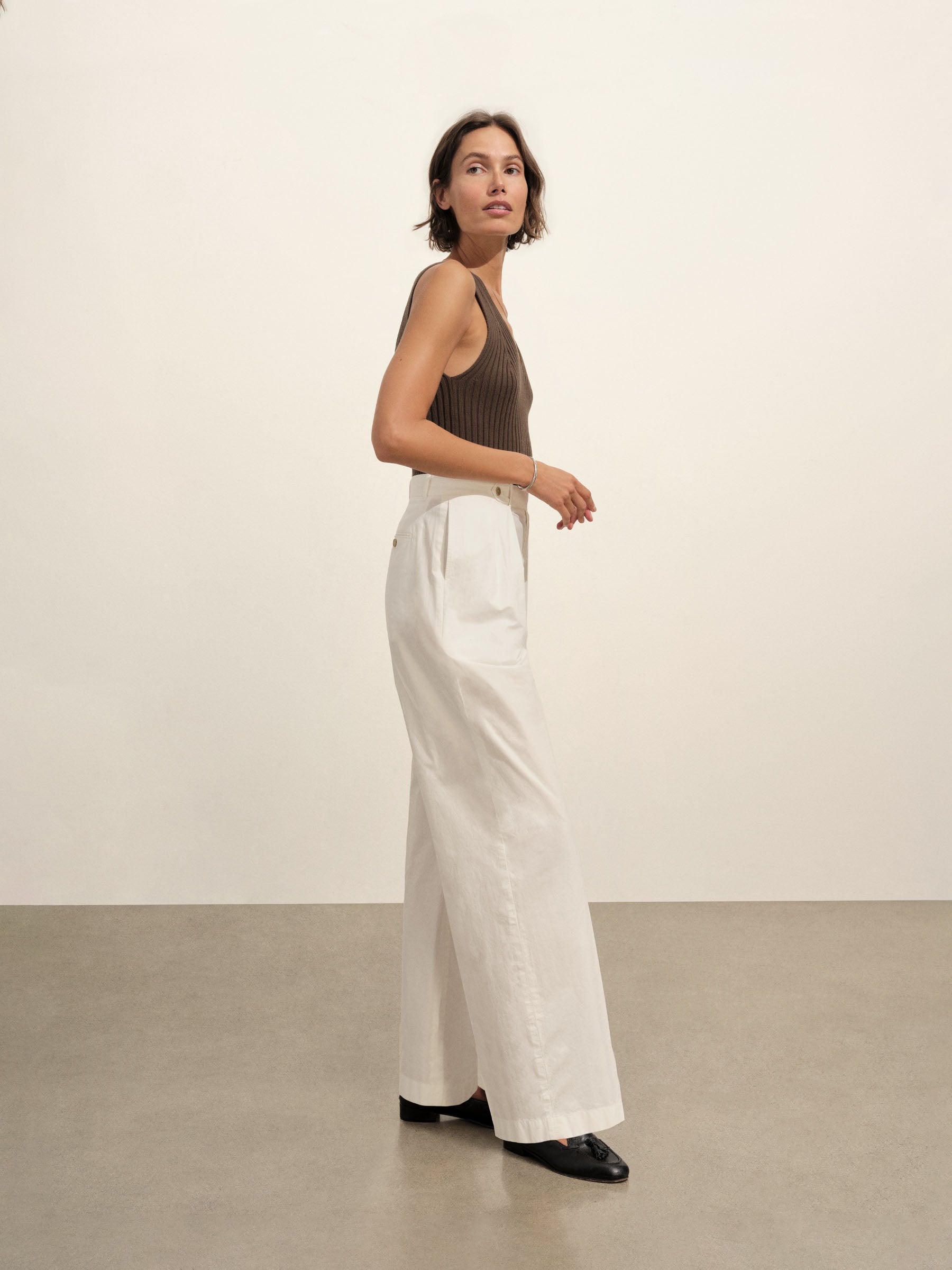 Taking inspiration from 1940s men’s trousers, a wide-leg pleated pant reimagined for modern wear. Cut from lightweight cotton poplin and framed with a 32” inseam and a high-rise. Featuring a button-through waistband extension, a single front coin pocket with button-down flap, and back welt pockets with a single button closure. Finished with corozo buttons and a zipper fly. Garment-washed for a vintage look and feel.