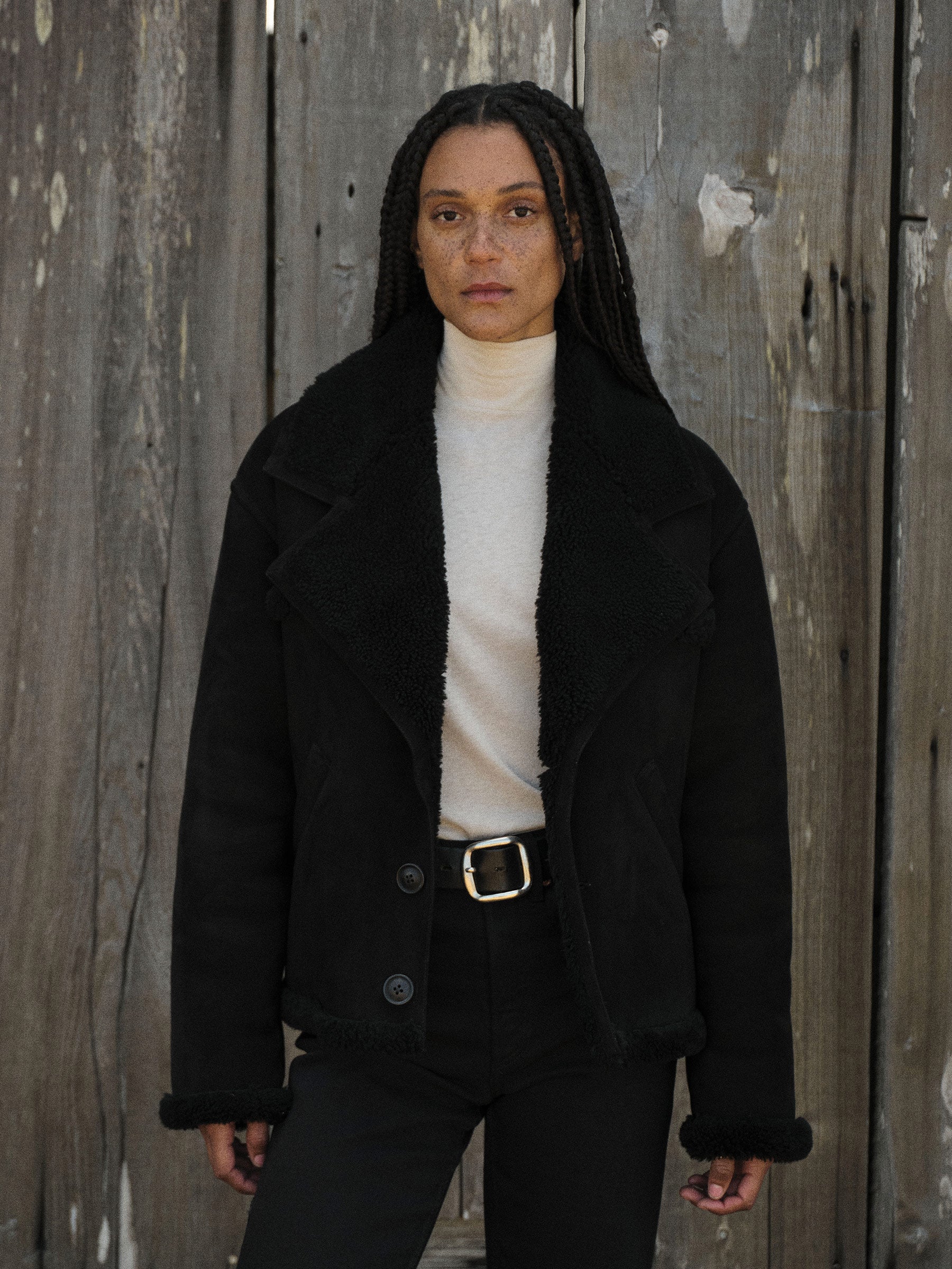 Relaxed shearling jacket in a 25” length. Hand-cut from vegetable tanned lambskin with a suede face and a semi-curl back. Authentic vintage details include easy armholes and sleeves for comfortable layering, horn buttons, and shearling-lined welt pockets. This hide has been vegetable tanned, top dyed, and tumbled for a lived-in look and feel.