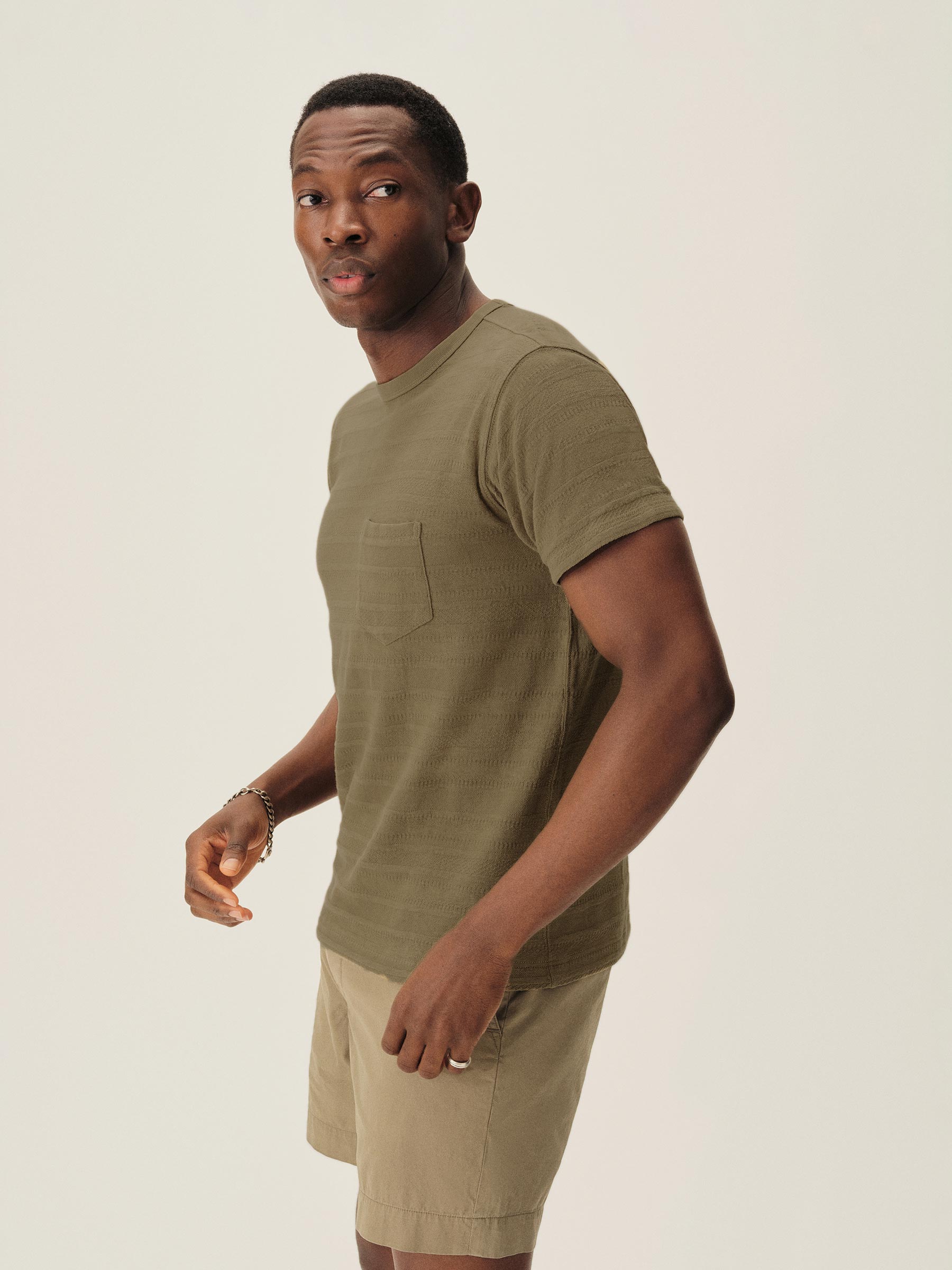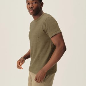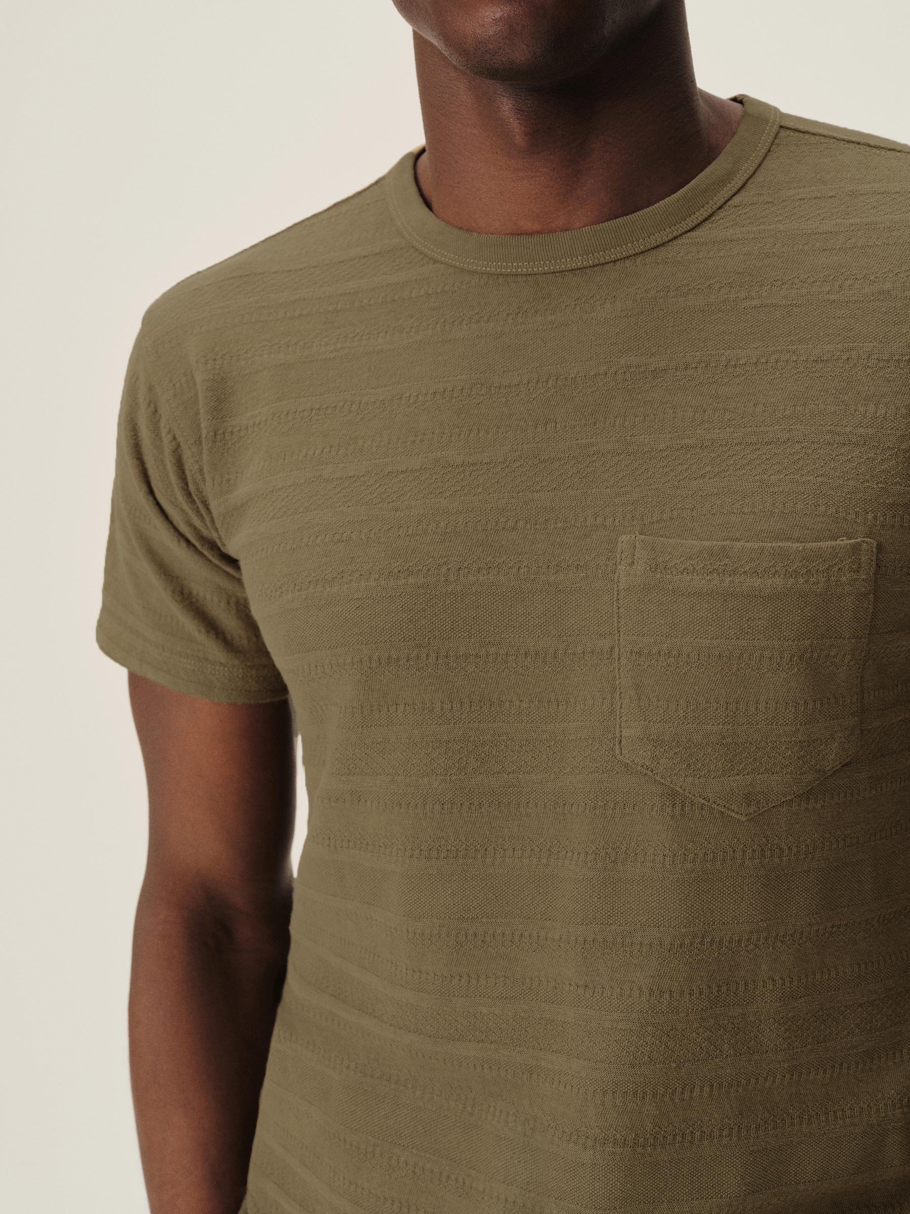 Classic fit short sleeve crewneck tee with a straight hem and patch chest pocket. Cut from a midweight cotton with tonal jacquard patterning. Garment washed for a lived-in feel.